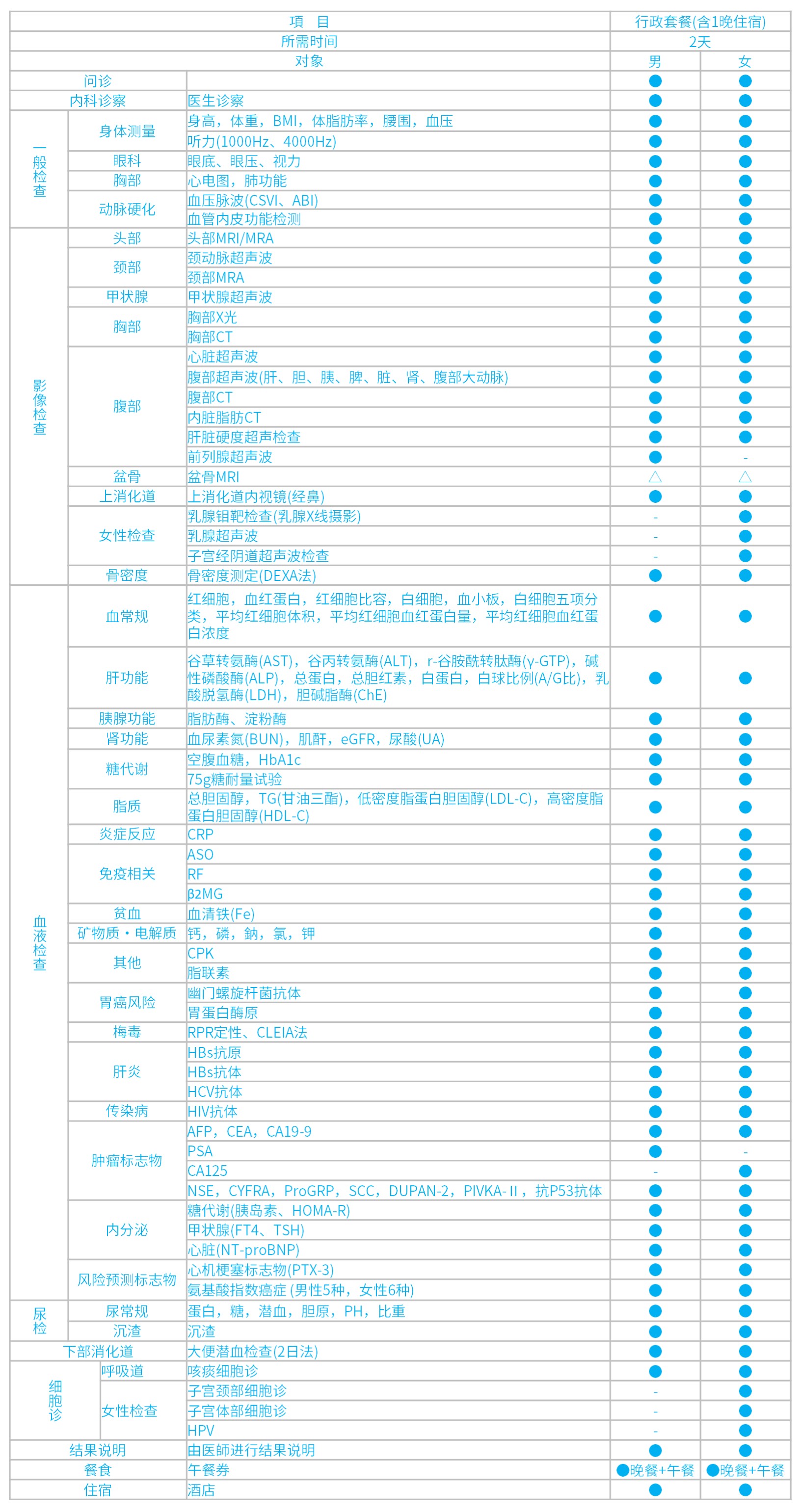 ●为检查项目。△为可追加项目,费用不含在套餐里。-为不可选项目。