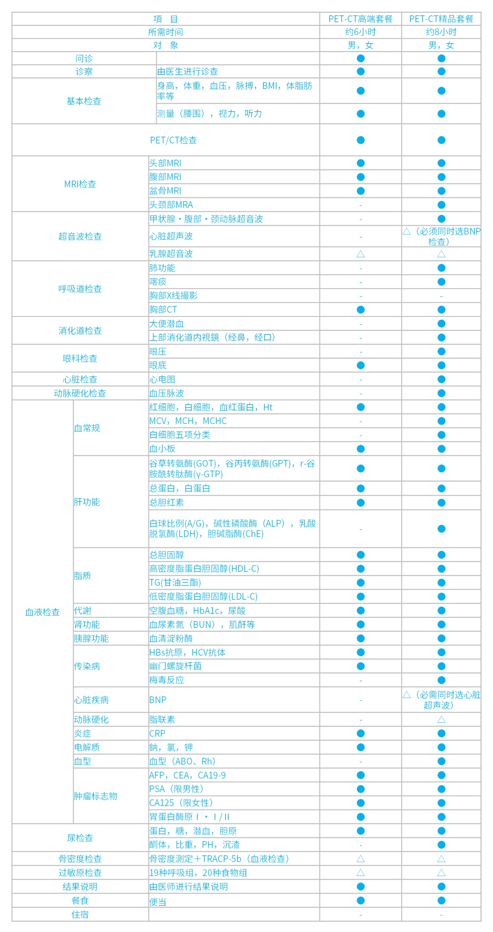 ●为检查项目。△为可追加项目,费用不含在套餐里。-为不可选项目。