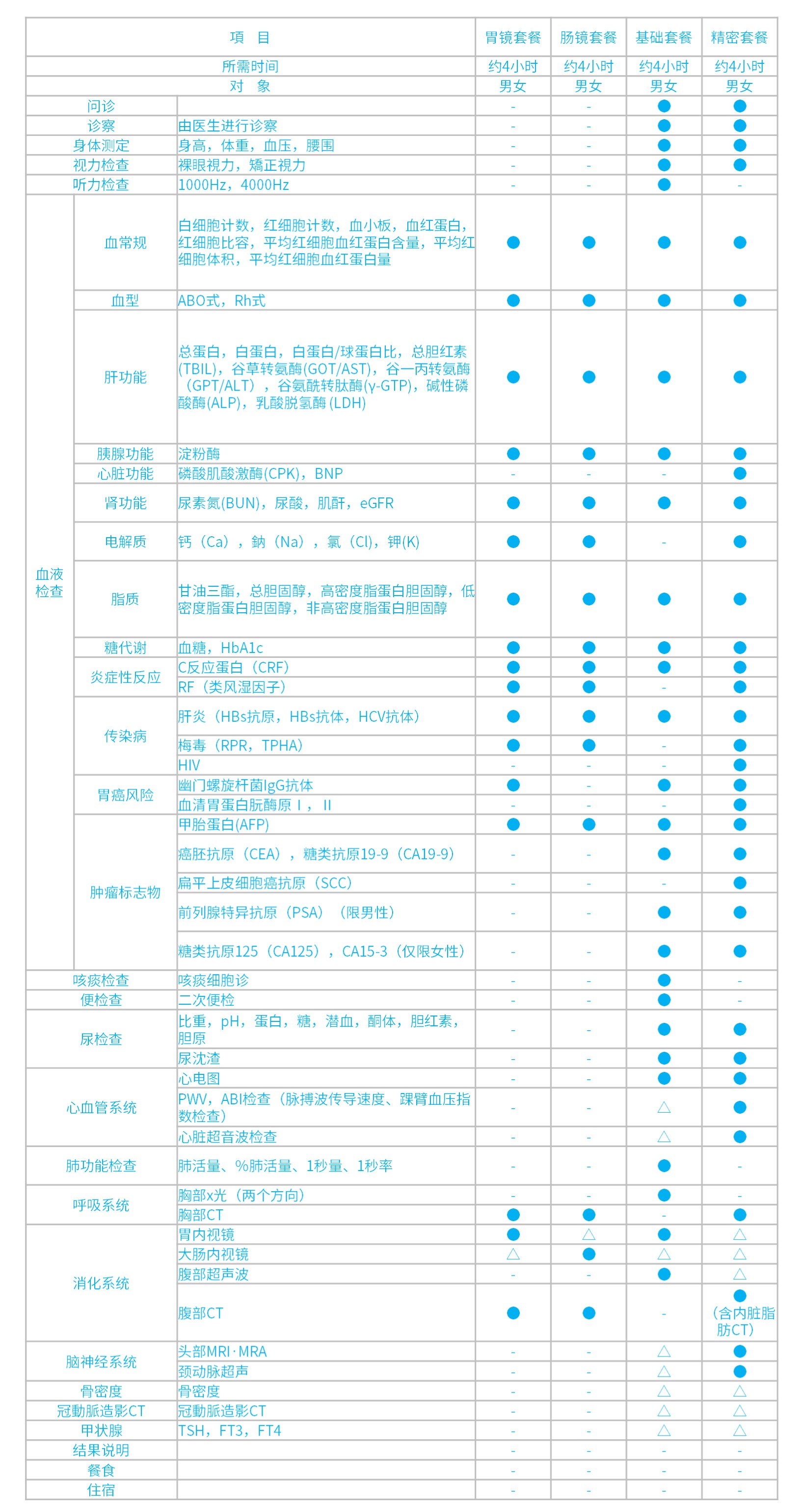 ●为检查项目。△为可追加项目,费用不含在套餐里。-为不可选项目。